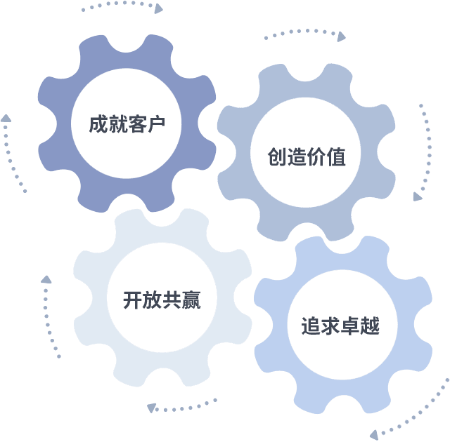 成就客户是一切决策的出发点,,,创造价值是衡量所有工作的标准,,,,追求卓越是我们做事做人的态度,,,,开放共赢是我们的格局也是最终的结果。。。。价值观的齿轮环环相扣,,,推动着组织里的每个人不断向前。。