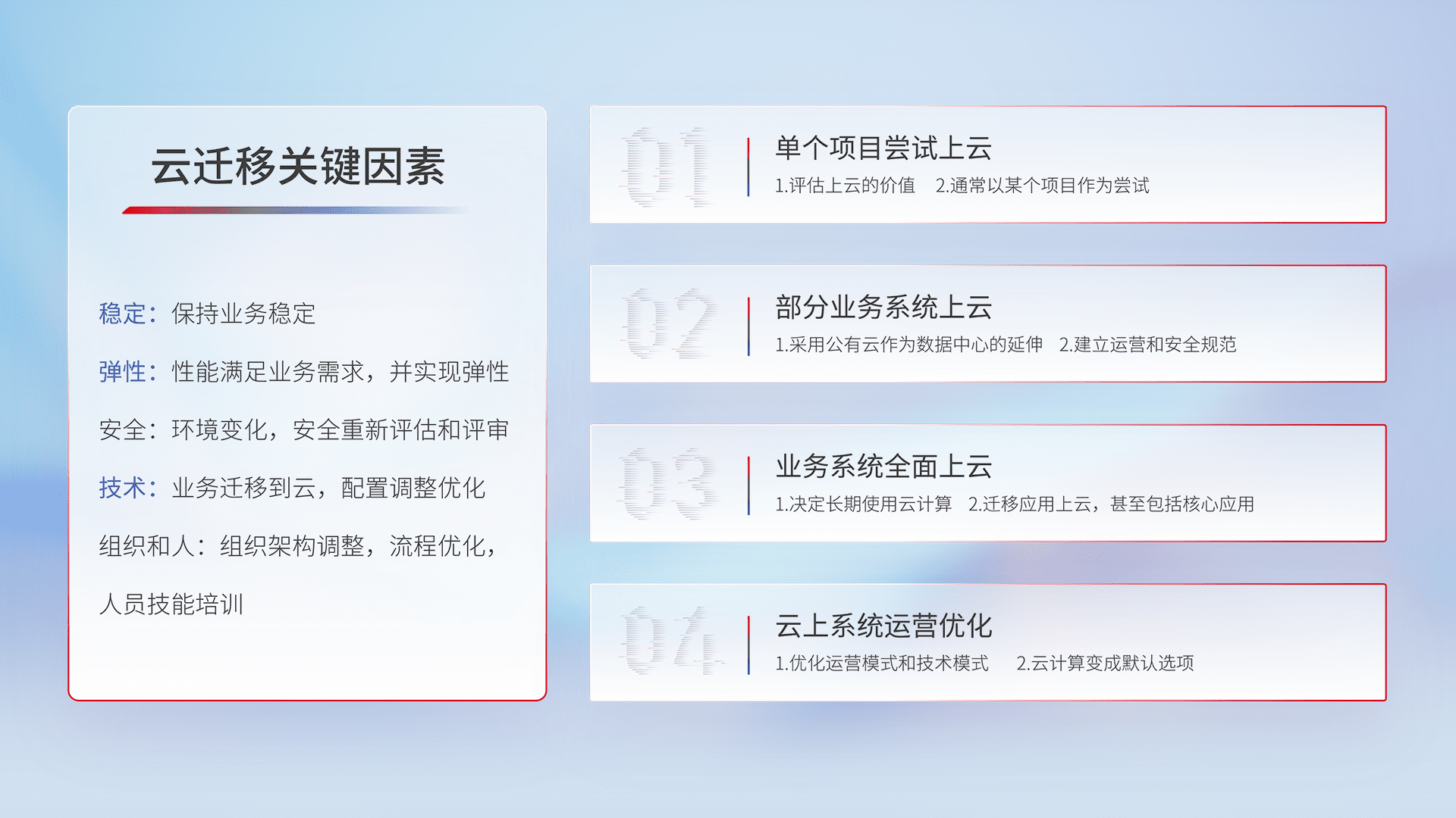结合实际业务,,从规划设计、、、、云平台选型、、、、云原生改造、、、、数据迁移、、集成交付,,,迁移全过程为客户识别最佳上云路径,,,做好风险识别管理,,,,设计网络架构、、、身份权限、、安全审计合规、、、、操作审计、、、、日志审计、、、、监控告警策略、、、、多站点容灾设计等,,对云上基础设施进行整体规划,,,,提升IT治理水平,,,,以满足弹性、、、高可用、、、高性能的需求。。