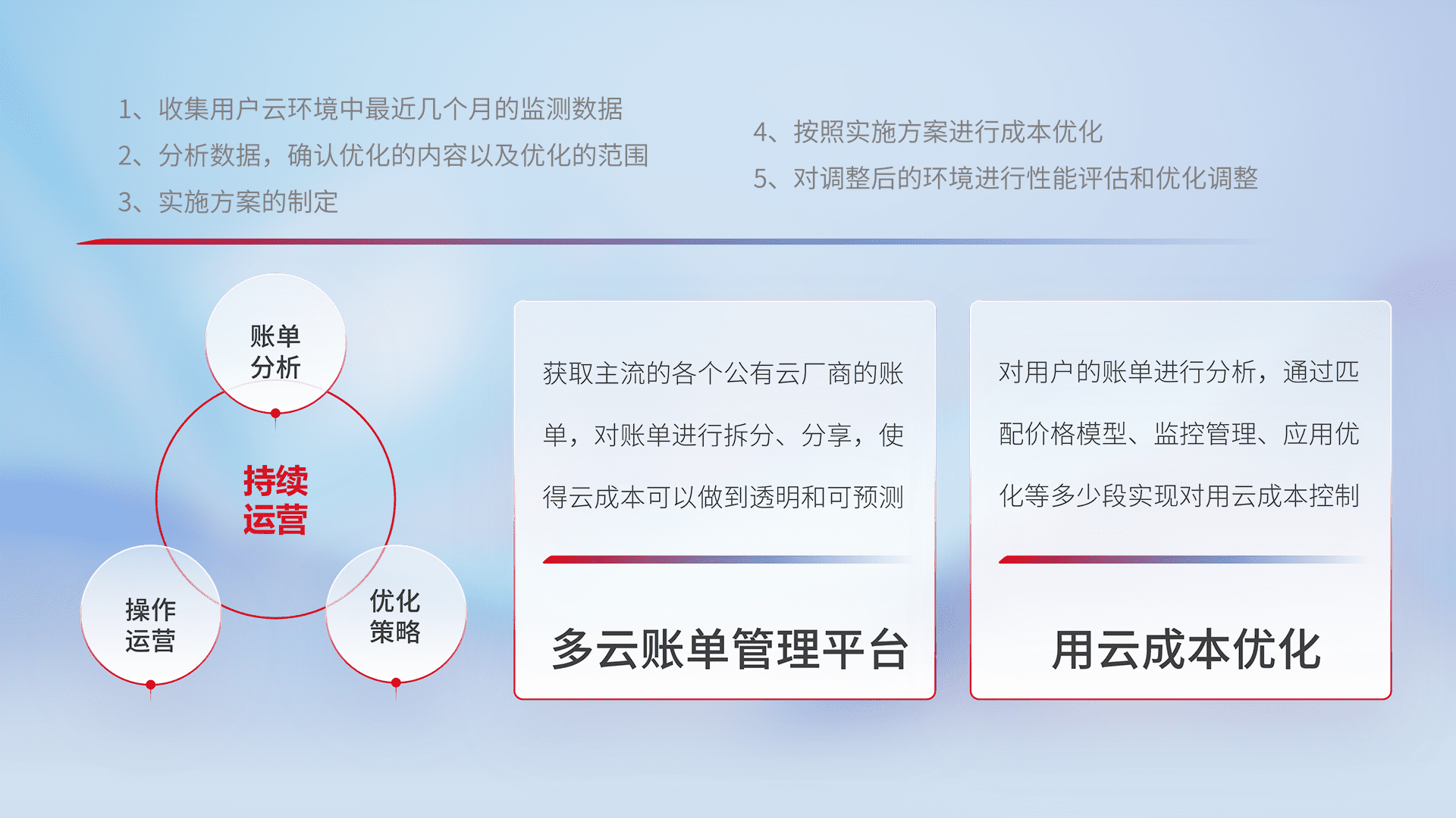 通过多云纳管,,,以统一的资源数据模型把客户的云资源进行抽象和封装,,进而实现对多云资源的统一操作,,,保障云资源管理的可靠性、、稳定性与可用性。。。。量身定制化运维内容,,,配置、、、、开发运维、、、、补丁管理、、、备份、、、监控、、、认证和访问管理、、、、审计和日常巡检等,,,保障在用云过程中的可靠度,,稳定度以及高可用率。。。。